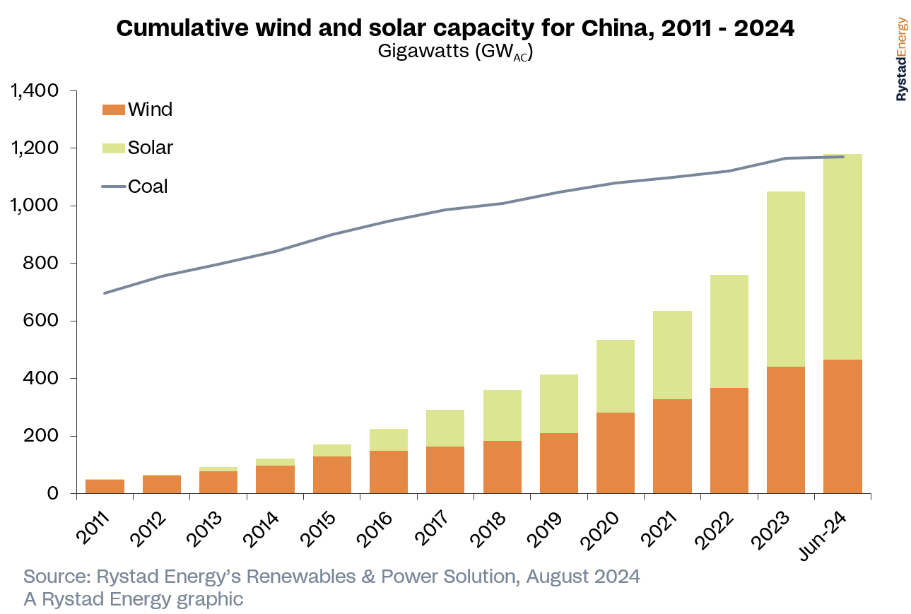While over 100 GW of new solar were deployed in China over the first six months of 2024, Rystad Energy found only 8 GW of coal was added. However, China remains the largest global consumer of coal, accounting for more than 50% of worldwide consumption.