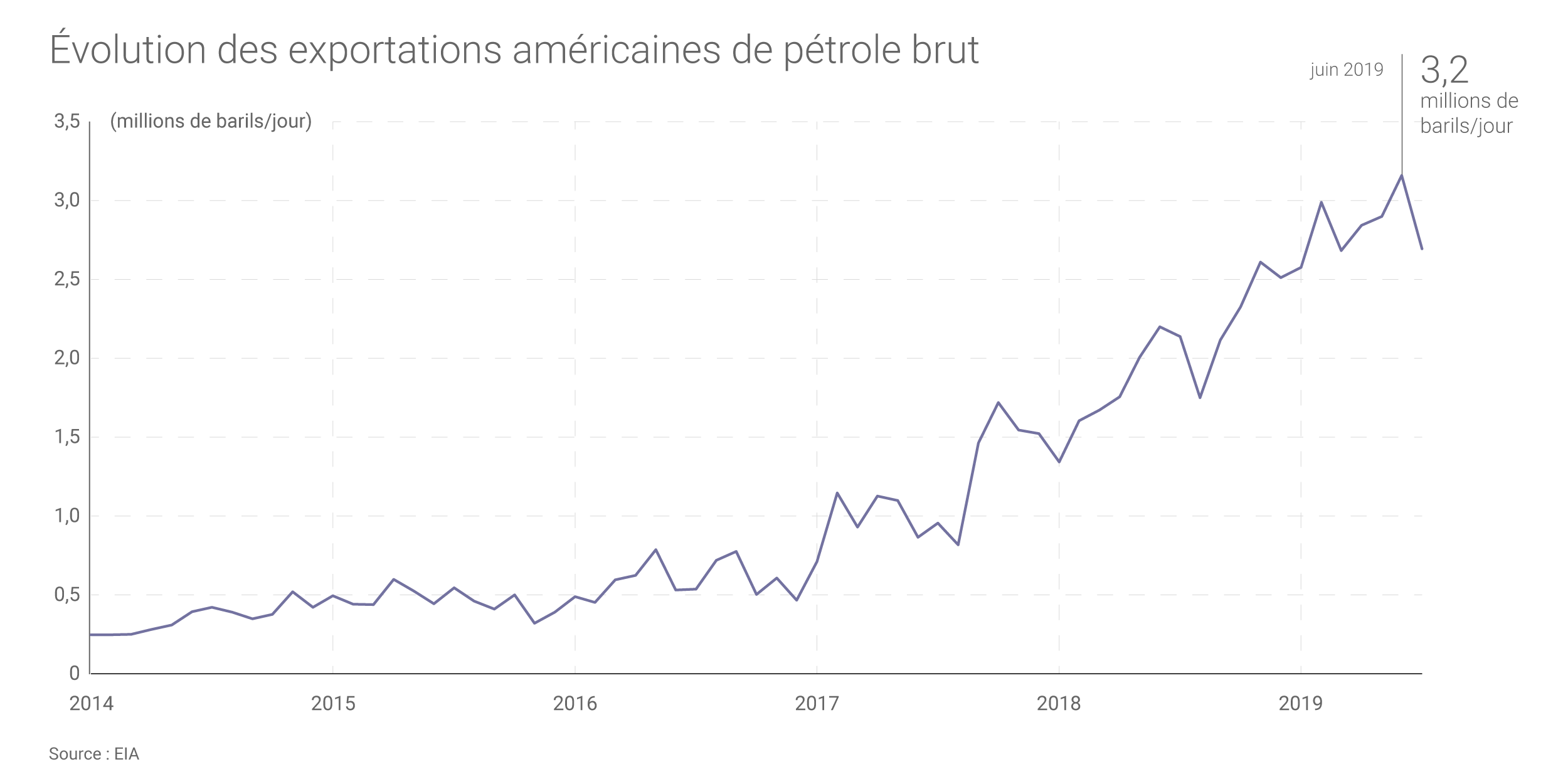 Les exportations américaines de pétrole brut ont atteint 2,9 millions de barils par jour (Mb/j) au 1er semestre 2019 (et jusqu'à 3,2 Mb/j au mois de juin 2019), alors qu'elles étaient encore inférieures à 0,5 Mb/j en 2015. Cette évolution est due à la croissance très rapide de la production d'hydrocarbures de schiste aux États-Unis depuis les années 2000 mais aussi à la levée des restrictions sur les exportations de brut américain fin 2015 par Barack Obama(2).