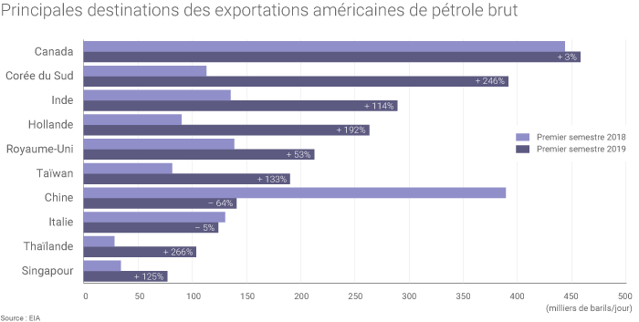 En juillet 2019, plus de 35% des exportations américaines de pétrole brut ont eu pour destinations 2 pays : la Corée du Sud (531 000 barils par jour) et le Canada (420 000 b/j). Les exportations des États-Unis ont très fortement augmenté au 1er semestre 2019 vers les pays asiatiques hors Chine et vers l'Europe de l'Ouest hors Italie.