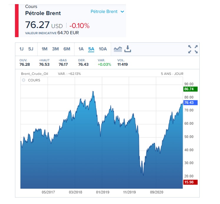 le prix du Brent sur 5 ans (dollars) :