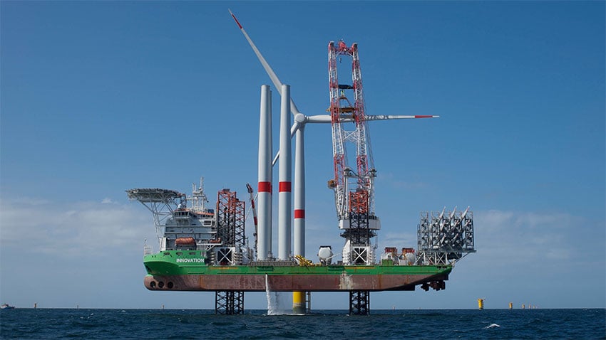 Le jack-up « Brave Tern » est arrivé le 8 mai sur site avec à son bord quatre mâts, quatre nacelles et douze pales. (Photo : Éric Houri)